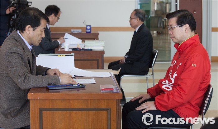 (세종=포커스뉴스) 제20대 국회의원 선거 후보자 등록 첫날인 24일 오전 세종시 조치원읍 세종시선거관리위원회에서 새누리당 박종준 후보와 무소속 이해찬 의원의 대리인이 후보 등록을 하고 있다.