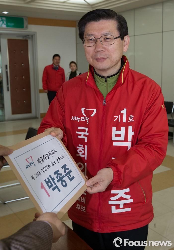 (세종=포커스뉴스) 제20대 국회의원 선거 후보자 등록 첫날인 24일 오전 세종시 조치원읍 세종시선거관리위원회에서 새누리당 박종준 후보가 등록 신청서를 제출하고 있다.