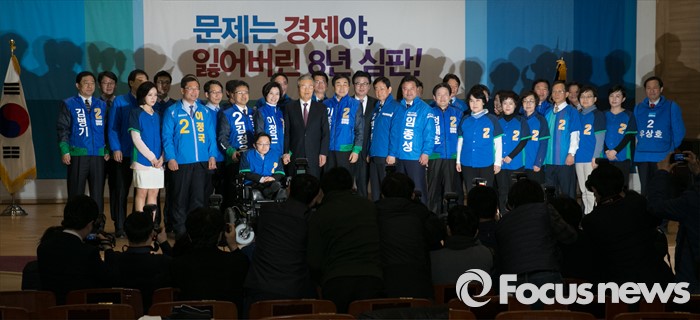(서울=포커스뉴스) 김종인 더불어민주당 비대위 대표가 24일 오전 서울 여의도 국회에서 열린 20대 총선 공천장 수여식에 참석해 후보들과 함께 기념촬영을 하고 있다.