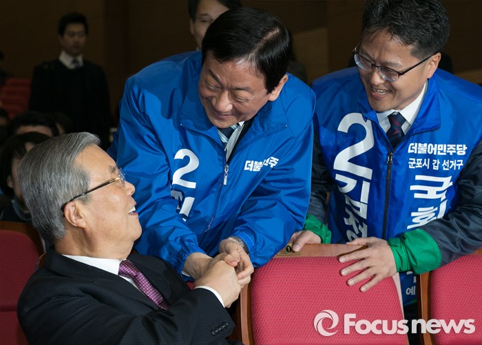 (서울=포커스뉴스) 김종인(왼쪽) 더불어민주당 비대위 대표가 24일 오전 서울 여의도 국회에서 열린 20대 총선 공천장 수여식에 참석해 진영(가운데) 의원, 김정우 경기 군포갑 후보와 인사하고 있다.