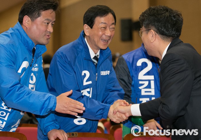 (서울=포커스뉴스) 새누리당을 탈당하고 더불어민주당에 입당한 진영(가운데) 의원이 24일 오전 서울 여의도 국회에서 열린 20대 총선 공천장 수여식에 참석해 이철희(오른쪽) 전략기획본부장과 악수하고 있다.