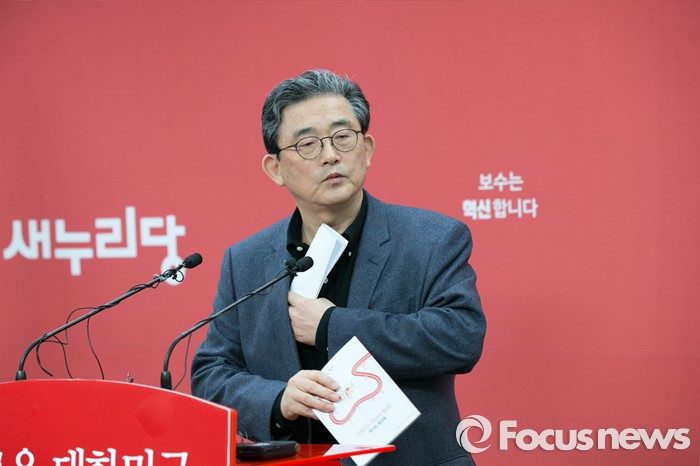 (서울=포커스뉴스) 이한구 새누리당 공천관리위원장이 24일 오전 서울 여의도 당사 브리핑실에서 기자회견을 마친 뒤, 단상을 내려오고 있다.