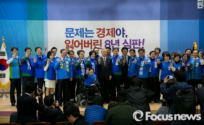(서울=포커스뉴스) 김종인 더불어민주당 비대위 대표가 24일 오전 서울 여의도 국회에서 열린 20대 총선 공천장 수여식에 참석해 후보들과 함께 기념촬영을 하고 있다.