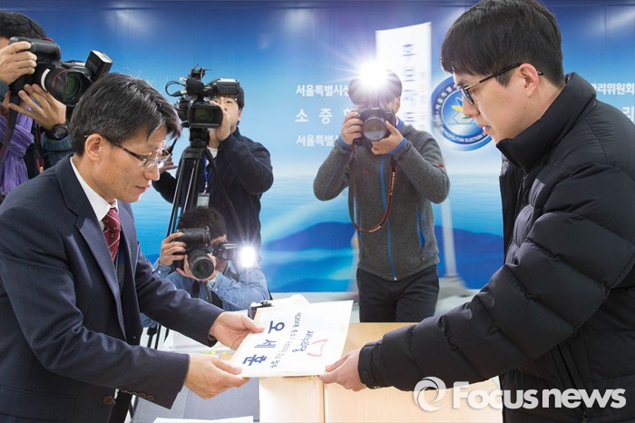 (서울=포커스뉴스) 20대 총선 후보자 등록이 시작된 24일 오전 서울 종로구 선관위에서 오세훈 후보의 대리인이 등록 서류를 제출하고 있다.