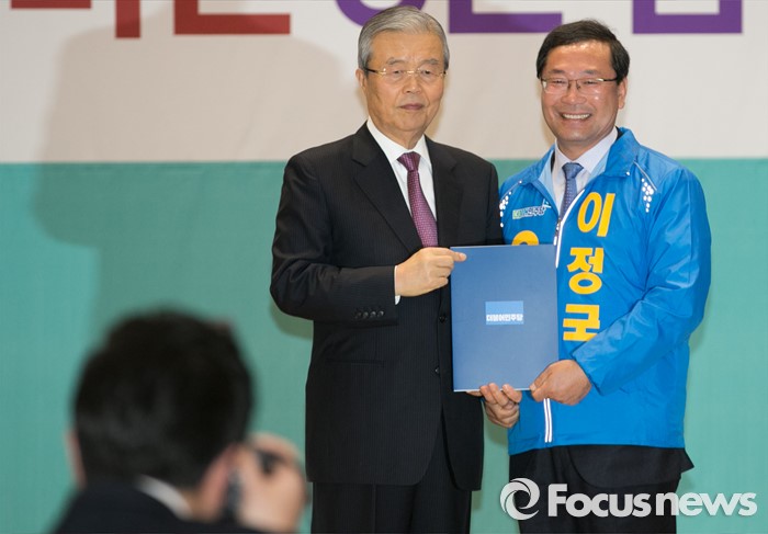 (서울=포커스뉴스) 김종인(왼쪽) 더불어민주당 비대위 대표가 24일 오전 서울 여의도 국회에서 공천장 수여식에 참석해 이정국 경기 안양 동안을 후보에게 공천장을 전달한 뒤 기념촬영을 하고 있다.