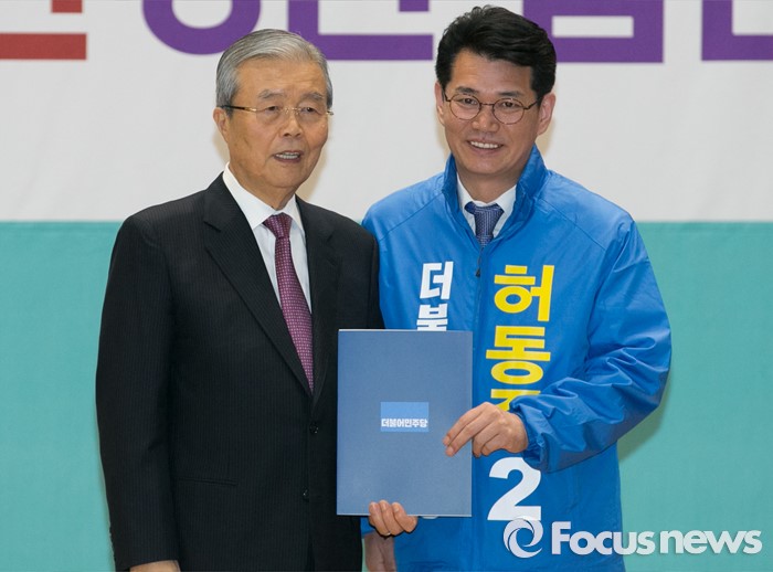 (서울=포커스뉴스) 김종인(왼쪽) 더불어민주당 비대위 대표가 24일 오전 서울 여의도 국회에서 공천장 수여식에 참석해 허동준 서울 동작을 후보에게 공천장을 전달한 뒤 기념촬영을 하고 있다.