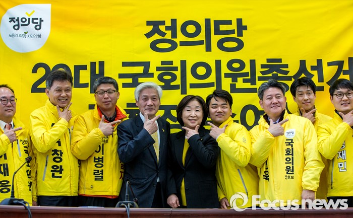 (서울=포커스뉴스) 심상정(오른쪽 다섯 번째) 정의당 상임대표가 24일 오전 서울 영등포구 국회에서 열린 '20대 국회의원총선거 공천장 수여식'에 참석해 김세균(왼쪽 네 번째) 정의당 공동대표 및 공천을 받은 후보들과 사진촬영을 하고 있다.