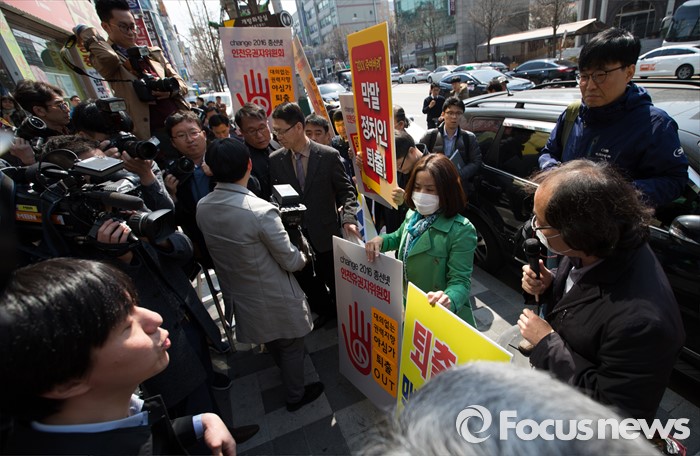 (인천=포커스뉴스) 새누리당을 탈당한 윤상현 의원의 무소속 출마 선언 기자회견이 열린 24일 오전 인천 남구 지역구 사무실 앞에서 2016 체인지 총선네트워크 인천유권자위원회 회원들이 윤상현 의원 출마 규탄 기자회견을 하고 있다.