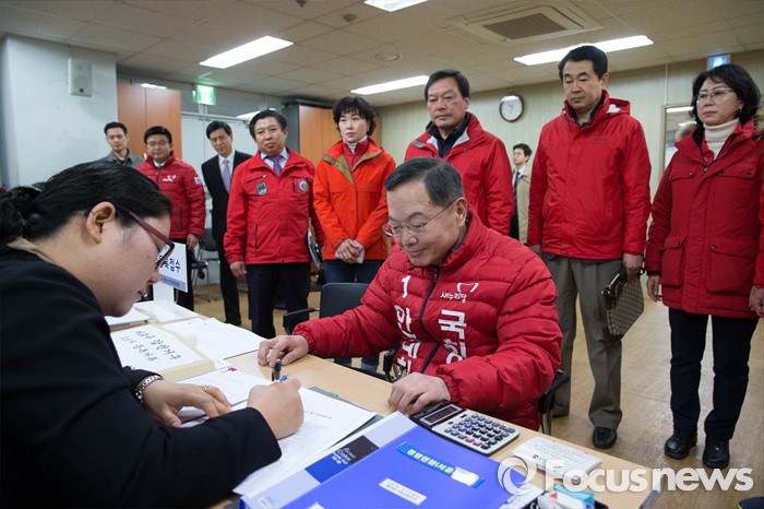 (서울=포커스뉴스) 20대 총선 후보자 등록이 시작된 24일 오전 서울 마포구 선관위에서 안대희 새누리당 후보가 등록 절차를 밟고 있다.