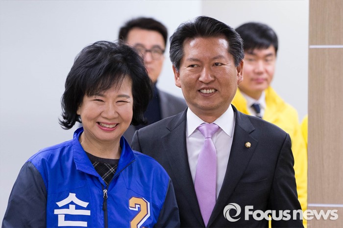 (서울=포커스뉴스) 20대 총선 후보자 등록이 시작된 24일 오전 서울 마포구 선관위에서 더불어민주당 손혜원 후보가 정청래 의원과 등록 서류를 제출하러 들어서고 있다.