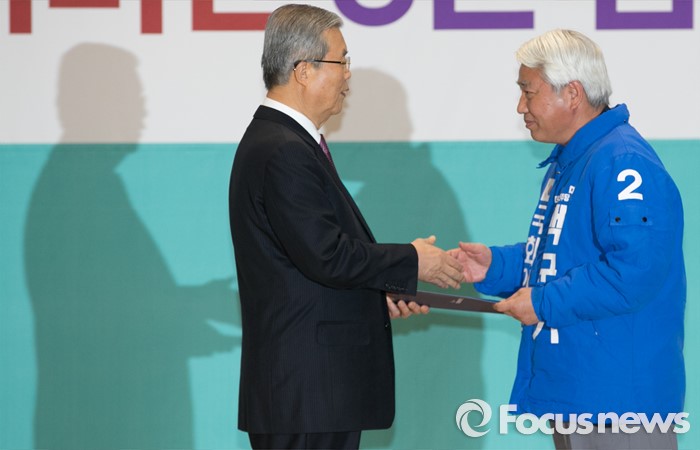 (서울=포커스뉴스) 김종인(왼쪽) 더불어민주당 비대위 대표가 24일 오전 서울 여의도 국회에서 공천장 수여식에 참석해 백군기(경기 용인갑) 의원에게 공천장을 전달하고 있다.