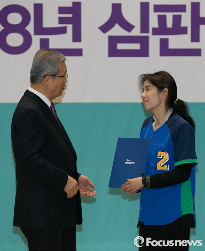 (서울=포커스뉴스) 김종인(왼쪽) 더불어민주당 비대위 대표가 24일 오전 서울 여의도 국회에서 공천장 수여식에 참석해 박경미 비례대표 후보와 기념촬영 후 대화하고 있다.
