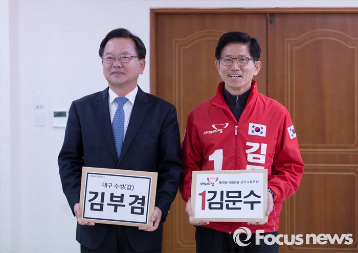 (대구=포커스뉴스) 4·13 총선에서 대구 수성갑 지역에 도전장을 던진 새누리당 김문수 전 경기지사와 더불어민주당 김부겸 전 의원이 24일 나란히 후보자등록을 했다.