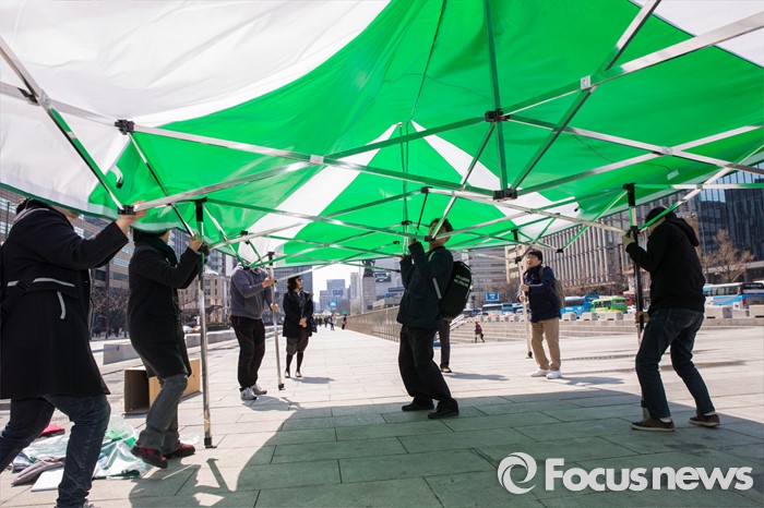 (서울=포커스뉴스) 24일 오전 서울 광화문광장에서 녹색당원들이 천막 선거사무소를 설치하고 있다.