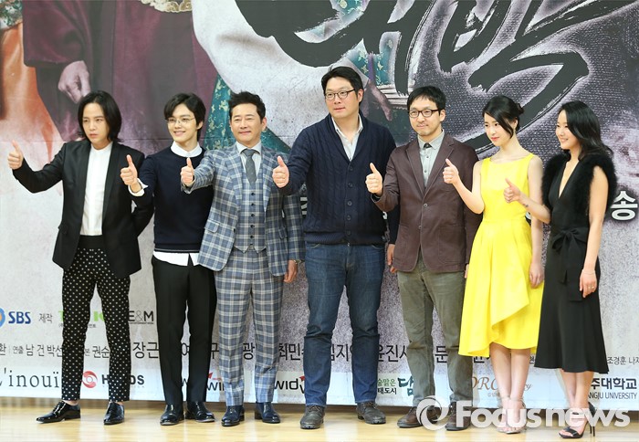 (서울=포커스뉴스) 24일 오후 서울 양천구 SBS 목동사옥에서 열린 월화드라마 '대박' 제작발표회에 참석한 배우 장근석, 여진구, 전광렬, 남건PD, 권순규 작가, 임지연, 윤진서가 포토타임을 갖고 있다.