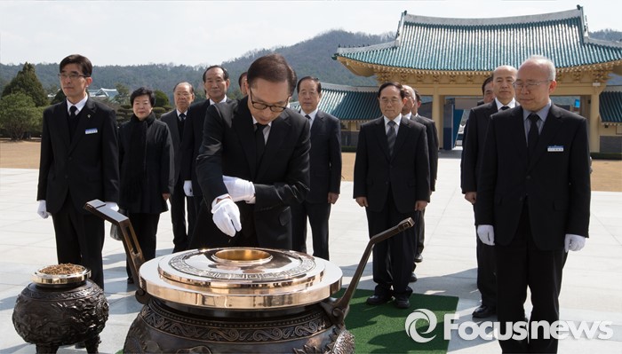 (대전=포커스뉴스) 이명박 전 대통령이 제1회 서해수호의날을 하루 앞둔 24일 국립대전현충원을 참배하고 있다.