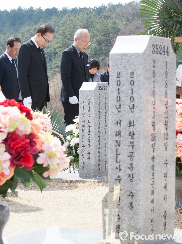 (대전=포커스뉴스) 이명박 전 대통령이 제1회 서해수호의날을 하루 앞둔 24일 오전 대전 유성구 국립대전현충원 천안함 46용사 묘역을 참배하고 있다.