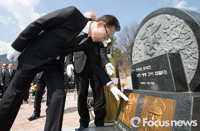 (대전=포커스뉴스) 이명박 전 대통령이 제1회 서해수호의날을 하루 앞둔 24일 오전 대전 유성구 국립대전현충원 연평도 포격 전사자묘역을 둘러보고 있다.