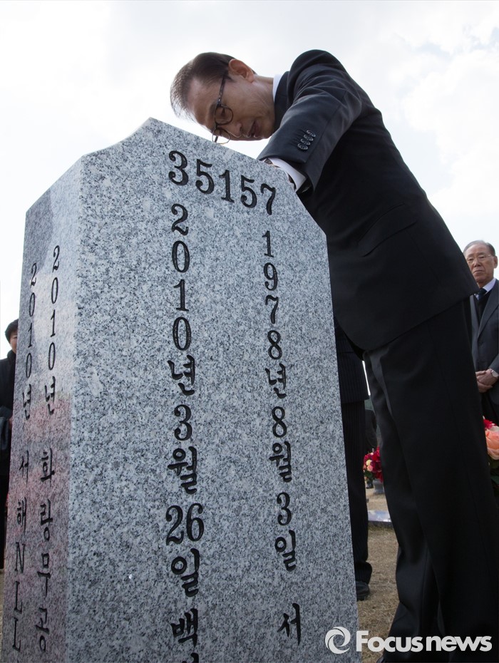 (대전=포커스뉴스) 이명박 전 대통령이 제1회 서해수호의날을 하루 앞둔 24일 국립대전현충원을 천안함 46용사 묘역을 방문해 눈가를 만지고 있다.
