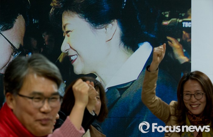 (대구=포커스뉴스) 24일 오후 대구 동구 방촌동의 이재만(대구 동구을) 후보 선거사무소에서 지지자들과 이야기를 나누는 이 후보 뒤로 박근혜 대통령의 사진이 보이고 있다.