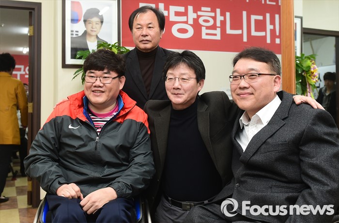 (대구=포커스뉴스) 전날 새누리당 탈당과 함께 무소속 출마를 선언한 대구 동구을 유승민 의원이 24일 오후 대구 동구의 사무소에서 지지자들과 만나 기념촬영을 하고 있다.