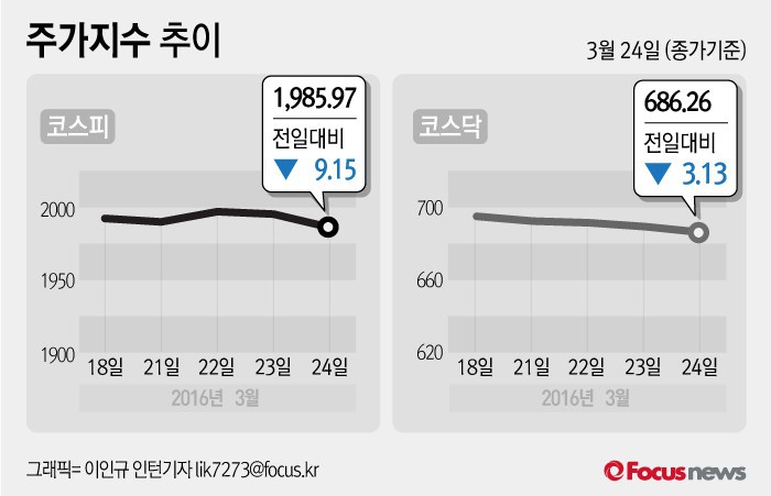 (서울=포커스뉴스) 24일 코스피지수는 전날 보다 0.46%(9.15포인트) 내린 1985.97에 장을 마쳤다. 코스닥지수는 전일 대비 0.45%(3.13포인트) 내린 686.26에 마감했다.