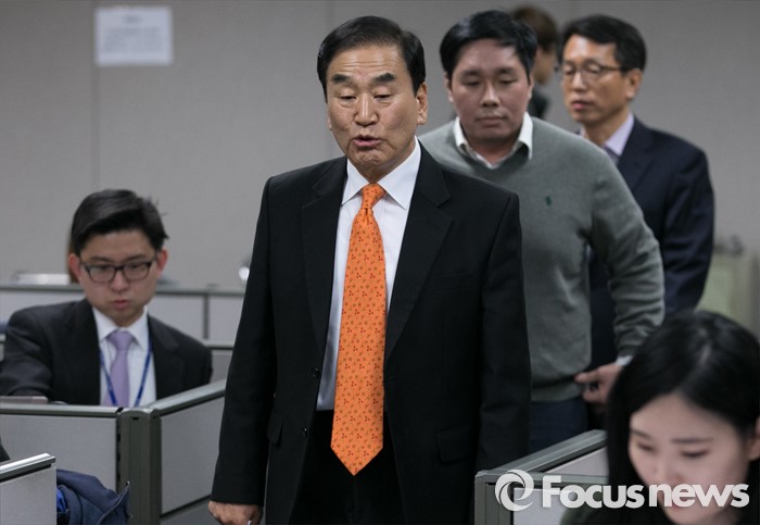 (서울=포커스뉴스) 새누리당을 탈당한 이재오 의원이 24일 오후 서울 여의도 국회 정론관에서 20대 총선 무소속 출마 기자회견을 위해 입장하고 있다.