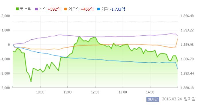 증시 전문가들은 "코스피가 2000선을 앞두고 지지부진한 모습을 보이면서 투자자들 사이에서 관망심리가 높아졌다"면서 "국제유가 급락과 브뤼셀 테러의 여파로 투자심리가 위축된 모습"이라고 진단했다.