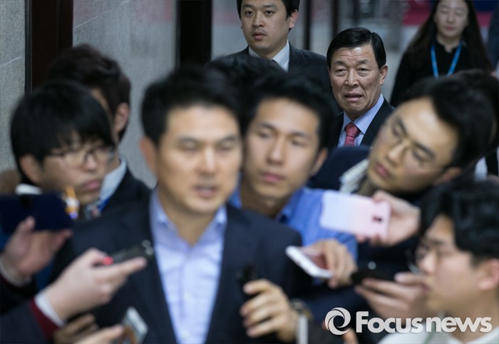 (서울=포커스뉴스) 김무성 새누리당 대표가 유승민 의원 지역구를 포함 5개 지역에 대한 최종 의결 거부하고 부산으로 떠난 24일 오후 서울 여의도 국회에서 열린 비공개 최고위원 간담회에 황진하(오른쪽 뒤) 사무총장이 취재진 질문에 답하고 있는 김태호 최고위원을 바라보며 이동하고 있다.