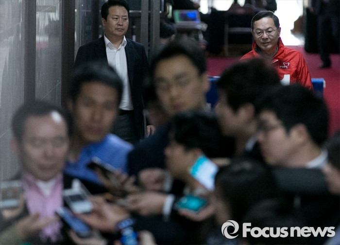 (서울=포커스뉴스) 김무성 새누리당 대표가 유승민 의원 지역구를 포함 5개 지역에 대한 최종 의결 거부하고 부산으로 떠난 24일 오후 서울 여의도 국회에서 열린 비공개 최고위원 간담회에 앞서 취재진 질의응답에 답하고 있는 이인제(왼쪽 아래) 최고위원 뒤로 안대희(오른쪽 위) 최고위원이 참석하고 있다.