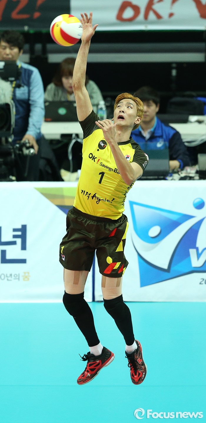 (안산=포커스뉴스) 24일 안산상록수체육관에서 열린 2015-2016 V-리그 남자부 챔피언결정전 4차전 OK저축은행-현대캐피탈 경기에서 OK저축은행 송명근이 스파이크 서브를 넣고 있다.