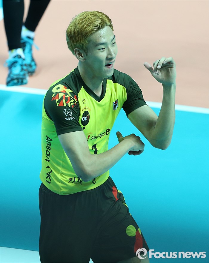 (안산=포커스뉴스) 24일 안산상록수체육관에서 열린 2015-2016 V-리그 남자부 챔피언결정전 4차전 OK저축은행-현대캐피탈 경기에서 OK저축은행 송명근이 득점 세리모니로 말춤을 추고 있다.