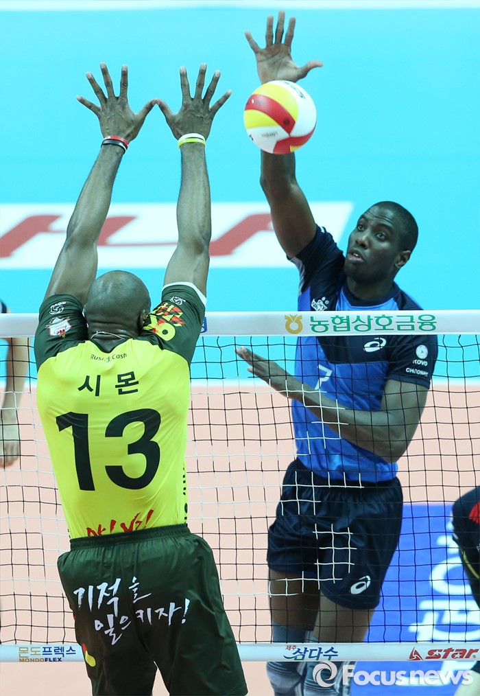 (안산=포커스뉴스) 24일 안산상록수체육관에서 열린 2015-2016 V-리그 남자부 챔피언결정전 4차전 OK저축은행-현대캐피탈 경기에서 현대캐피탈 오레올이 OK저축은행 시몬의 블로킹을 피해 연타로 볼을 넘기고 있다.