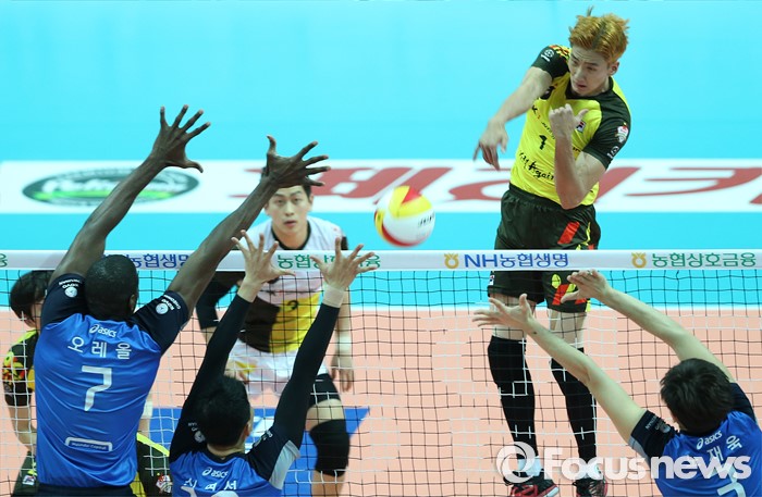 (안산=포커스뉴스) 24일 안산상록수체육관에서 열린 2015-2016 V-리그 남자부 챔피언결정전 4차전 OK저축은행-현대캐피탈 경기에서 OK저축은행 송명근이 현대캐피탈의 3중 블로킹 위로 연타 공격을 하고 있다.
