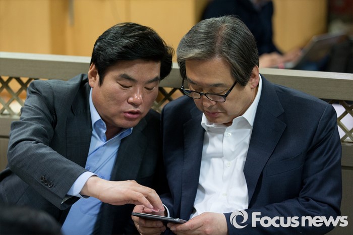 (부산=포커스뉴스) 당 공천관리위원회의 공천안에 반발해 최고위원회의 소집을 거부한 김무성 새누리당 대표와 설득에 나선 원유철 원내대표가 24일 오후 부산 중구 자갈치시장에서 만나 저녁식사를 하며 이야기를 나누고 있다.