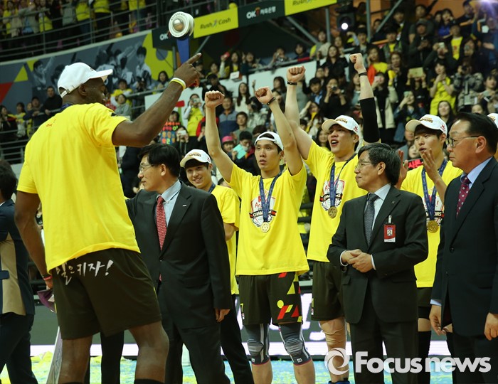 (안산=포커스뉴스) 24일 안산상록수체육관에서 열린 2015-2016 V-리그 남자부 챔피언결정전 4차전에서 챔피언전 MVP를 수상한 OK저축은행 시몬에게 선수들이 축하의 박수를 치고 있다.