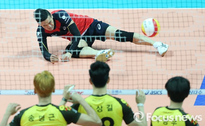 (안산=포커스뉴스) 24일 안산상록수체육관에서 열린 2015-2016 V-리그 남자부 챔피언결정전 4차전에서 현대캐피탈 리베로 여오현이 OK저축은행 시몬의 스파이크 서브에 리시브 범실을 하고 있다.