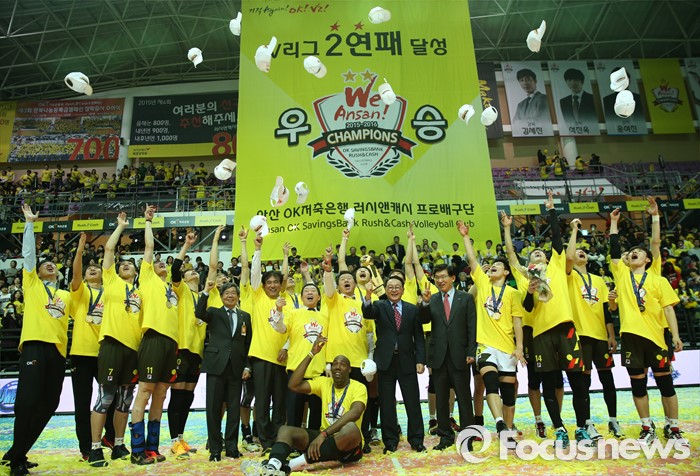 (안산=포커스뉴스) 24일 안산상록수체육관에서 열린 2015-2016 V-리그 남자부 챔피언결정전에서 현대캐피탈을 3승1패로 물리치고 2연패를 달성한 OK저축은행 김세진 감독을 비롯한 선수들이 챔피언 모잘르 높이 던지며 환호하고 있다.