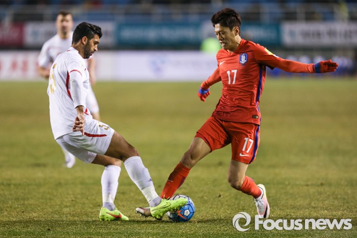 (안산=포커스뉴스) 24일 오후 경기도 안산 와스타디움에서 열린 2018 러시아 월드컵 아시아 2차 예선 7차전 대한민국 대 레바논 경기에서 이청용 선수가 레바논 선수와 볼다툼을 하고 있다.