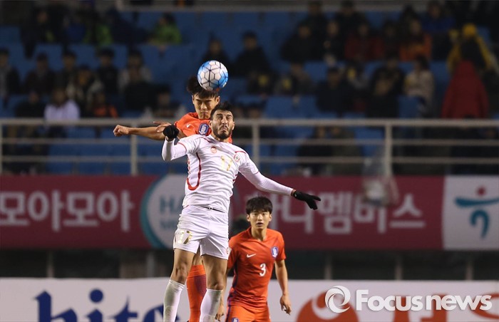 (안산=포커스뉴스) 24일 오후 경기도 안산 와스타디움에서 열린 2018 러시아 월드컵 아시아 2차 예선 7차전 대한민국 대 레바논 경기에서 양 팀 선수들이 공중볼 다툼을 하고 있다.