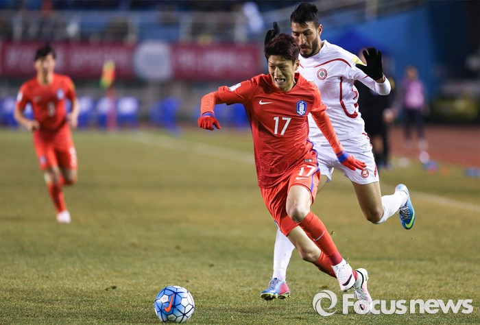 (안산=포커스뉴스) 24일 오후 경기도 안산 와스타디움에서 열린 2018 러시아 월드컵 아시아 2차 예선 7차전 대한민국 대 레바논 경기에서 이청용 선수가 레바논 선수를 제치고 드리블을 하고 있다.