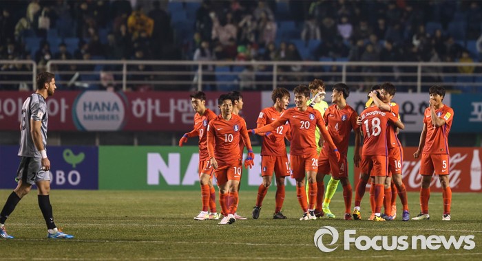 (안산=포커스뉴스) 24일 오후 경기도 안산 와스타디움에서 열린 2018 러시아 월드컵 아시아 2차 예선 7차전 대한민국 대 레바논 경기가 대한민국 축구 국가대표팀의 1:0 승리로 끝난 후 선수들이 승리를 축하하며 기쁨을 나누고 있다.
