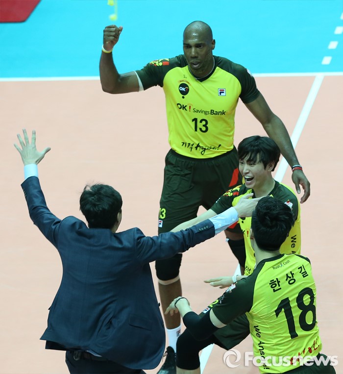 (안산=포커스뉴스) 24일 안산상록수체육관에서 열린 2015-2016 V-리그 남자부 챔피언결정전 4차전에서 OK저축은행이 현대캐피탈을 물리치고 3승1패로 2연패를 달성했다. 김세진 감독과 선수들이 환호하고 있다.
