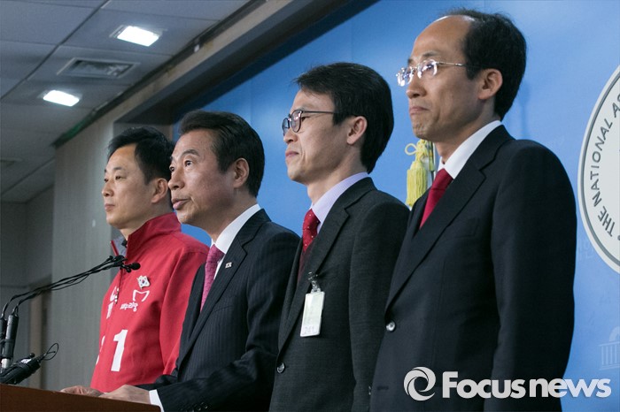 (서울=포커스뉴스) 김무성 새누리당 대표가 무공천을 선언한 지역구 후보들이 25일 오전 서울 여의도 국회 정론관에서 기자회견을 하고 있다. 왼쪽부터 유영하(서울 송파구을), 정종섭(대구 동구갑), 류재길(서울 은평구을), 추경호(대구 달성) 예비후보.
