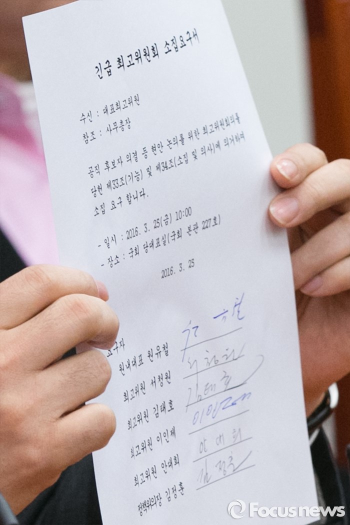 (서울=포커스뉴스) 원유철 원내대표가 25일 오전 서울 여의도 국회 원내대표실에서 열린 최고위원회 간담회에 참석해, 긴급 최고위원회 소집요구서를 보이고 있다.
