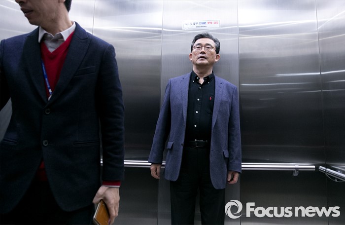 (서울=포커스뉴스) 김무성 새누리당 대표가 당 공천관리위원회의 결정에 반발해 유승민 의원 등 지역구 6곳에 대해 무공천을 선언해 갈등이 이어지고 있는 25일 오전 서울 여의도 당사로 이한구 공천관리위원장이 승강기에 올라 이동하고 있다.