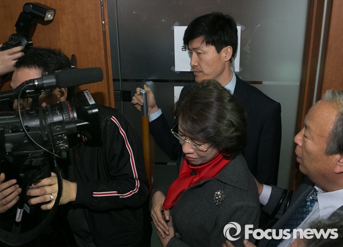 (서울=포커스뉴스) 김무성 새누리당 대표가 당 공천관리위원회의 결정에 반발해 유승민 의원 등 지역구 6곳에 대해 무공천을 선언해 갈등이 이어지고 있는 25일 오전 서울 여의도 당사 김 대표실 앞에서 이인선 대구 수성을 예비후보가 대화를 요청하고 있다.