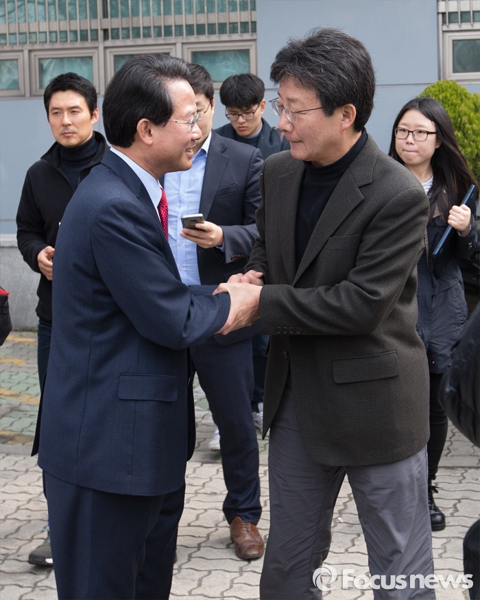 (대구=포커스뉴스) 25일 오전 대구 동구선거관리위원회에서 유승민(오른쪽, 대구 동을) 의원과 류성걸(대구 동갑) 의원이 후보자 등록 후인사를 나누고 있다.