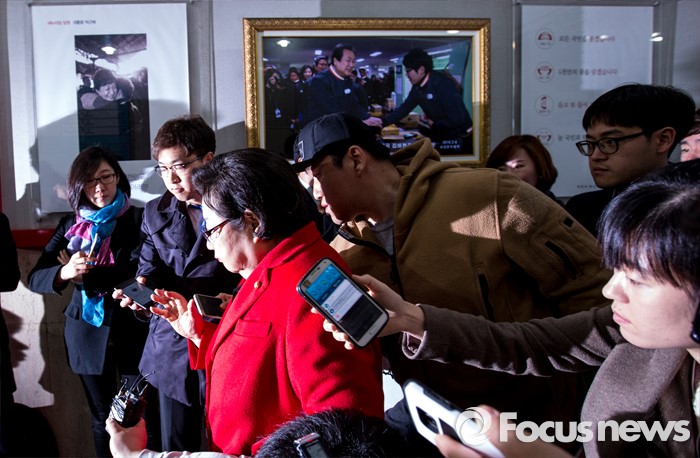 (서울=포커스뉴스) 이른바 진박 후보 공천장에 도장 못찍는다며 김무성 새누리당 대표의 '옥새투쟁'이 이어지고 있는 25일 오전 서울 영등포구 새누리당사 앞에서 김을동 새누리당 최고위원이 회의에 참석하기 위해 이동 하고 있다.