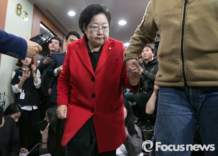 (서울=포커스뉴스) 김무성 새누리당 대표가 당 공천관리위원회의 결정에 반발해 유승민 의원 등 지역구 6곳에 대해 무공천을 선언해 갈등이 이어지고 있는 25일 오전 서울 여의도 당사에서 열린 비공개 최고위원회의에 김을동 최고위원이 참석하고 있다.